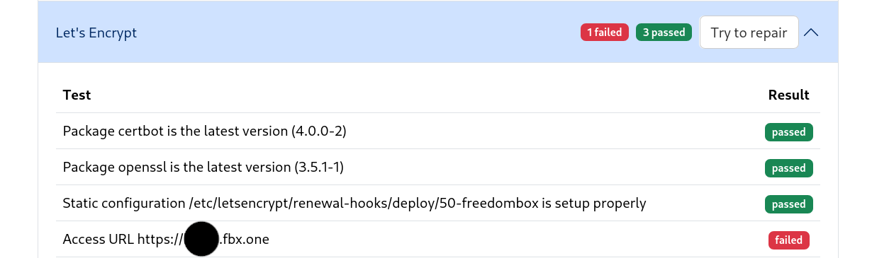 This afternoon I got the same Diagnostic message : Access URL https://domain.fbx.one failed