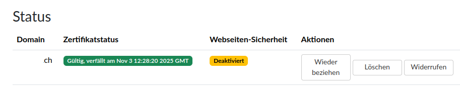 After updating on trixie I have an issue with let’s encrypt. Website security is disabled (Deaktiviert). I did rerun installation from the backup, but the issue did not disappear.