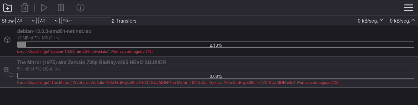 The first file comes from a torrent file and had that error when I paused the download. The second file comes from a magnet link and had that error during the download. Both downloaded data before reaching the error. Transmission is configured to save partial files in /var/lib/transmission-daemon/Downloads and complete files in /var/lib/freedombox/shares/group_share.